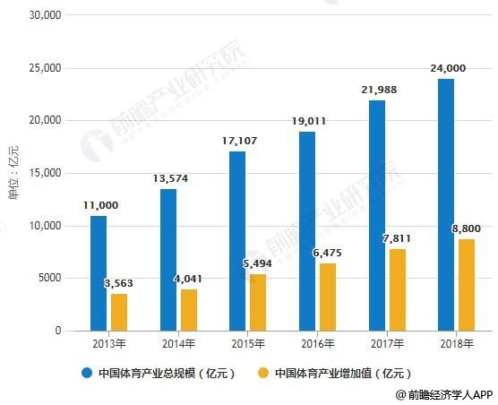 据前瞻产业研究院发布的《中国体育产业发展前景预测与投资战略规划分析报告》统计数据显示,2014-2017年,中国体育产业总规模从1.35万亿增长到2.2万亿,年均增长速度在18%左右。从增加值看,2014年中国体育产业增加值达4040亿,截止至到2017年中国体育产业增加值增长至7811亿元,年均增长19%。2018年的数据尚未发布,估算全国体育产业总规模2.4万亿元,同比增长9.09%,实现增加值8800亿元,同比增长12.82%。