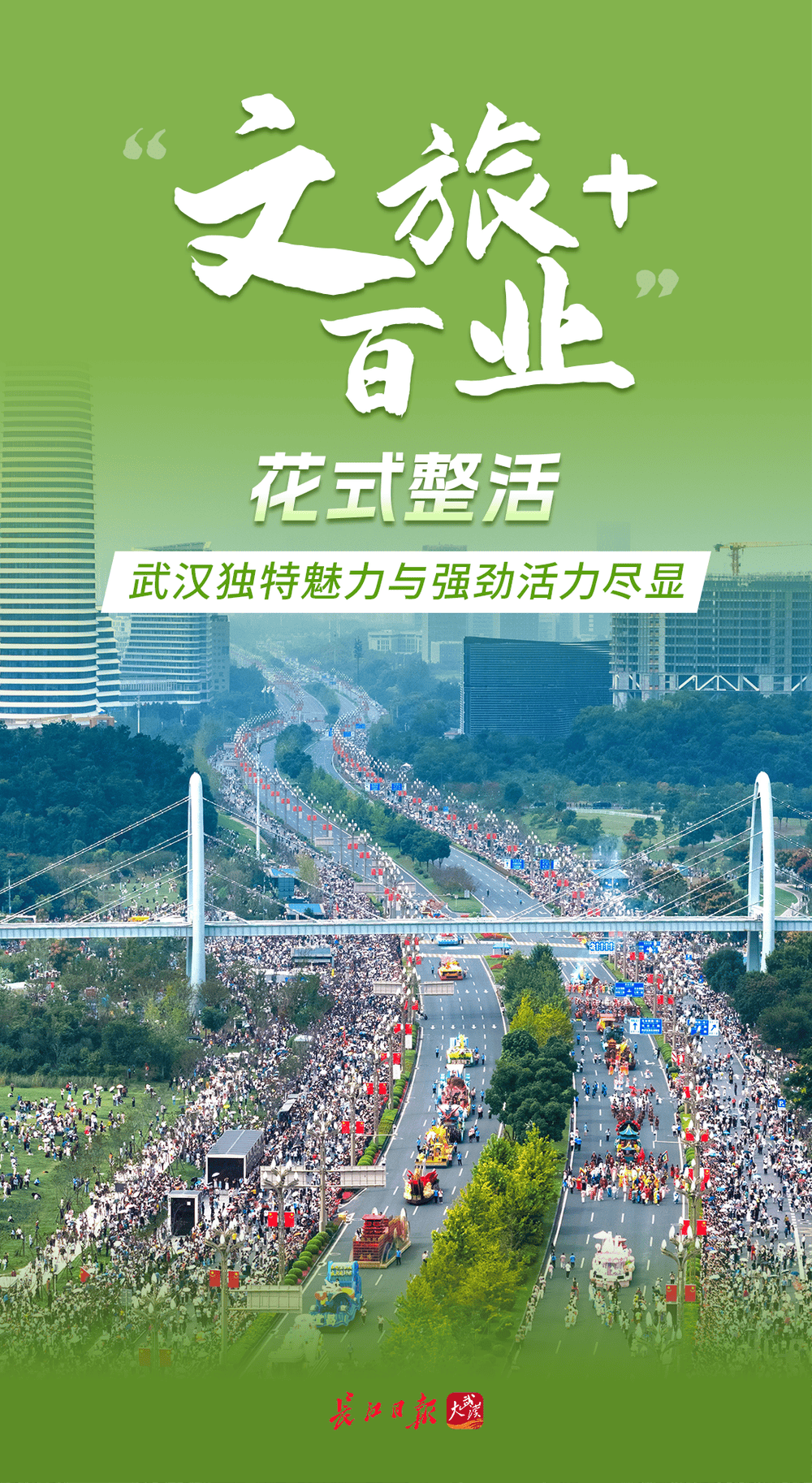 “河山添锦绣——文旅IP武汉城市大巡游”于10月1日在武汉光谷开游,23台主题花车,融合全国各地特色民俗、非遗项目的38家国内外顶尖演艺团队联袂献艺,近10万市民游客现场观看,来鄂游客大呼“来得值”。